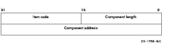The second field contains a user-supplied, word-length symbolic code that specifies the component desired. The item codes are defined by the macros specific to the service. The third field is a longword in which the service writes the starting address of the component. This address is within the input string itself. |