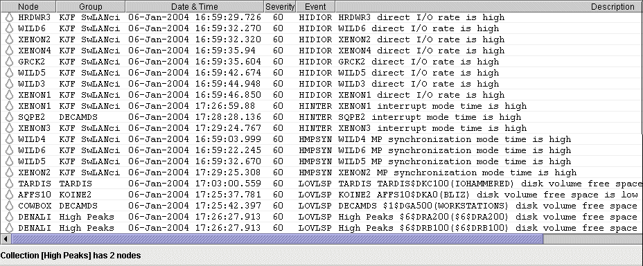 The Data Analyzer can display events for all nodes that are currently in communication with the Data Analyzer. When an event of a certain severity occurs, the Data Analyzer adds the event to a list in the Event pane.
