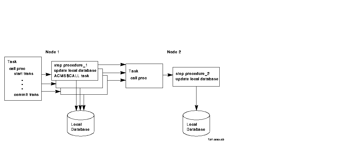 In Figure 6-8, the ACMS$CALL in the step procedure on Node 1