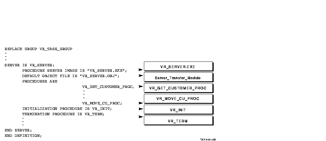 Figure 6-3 shows the relationship between the task group definition and object modules when they are linked to create a procedure server image.