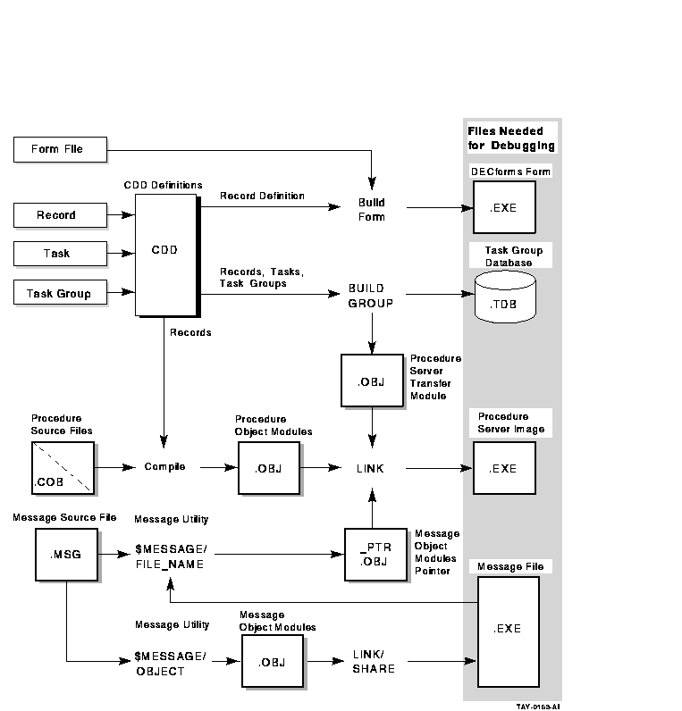 One of the difficult parts of debugging a task is making sure that all the files you need are complete. Chapter 6 explains the steps you take to build a procedure server image. After completing those steps, check that all the files are ready. Figure 7-1 shows the files needed for debugging and depicts how you produce those files from CDD definitions, source programs, and message source files.