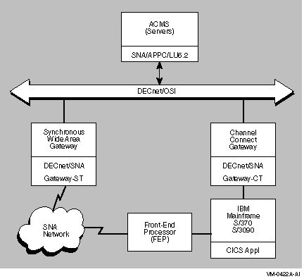 Figure 13-3 shows a Compaq server node running ACMS (with APPC/LU6.2 running on the same Compaq system). The Compaq computer can be attached either to Compaq's proprietary network DECnet, or to an Open Systems Interconnection (OSI) network.