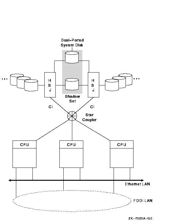 図 10-3 では,3 つのノードは CI インターコネクトで 2 つの HSC コントローラに接続されています。重要なシステム・ディスクは,デュアル・ポート化され,シャドウ化されています。