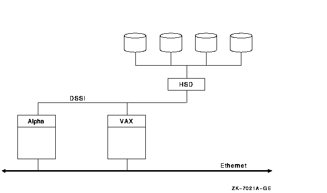 図 10-8 で,2 つのノードは,共通 DSSI インターコネクトで 4 つのディスクに接続されています。