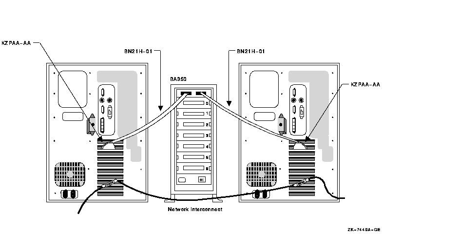 共用 BA350 ストレージ・エンクロージャは,理論的には単一点障害の要因になり得ますが,この基本システムは非常に信頼性が高い SCSI OpenVMS Cluster 構成です。クォーラム・ディスクが BA350 にある場合, OpenVMS Cluster システムとのアクセスを維持しながら,どちらの AlphaStation システムも単独でシャット・ダウンできます。ただし, AlphaStation システムを物理的に取り外すことはできません。終端がない SCSI バスが生じるからです。