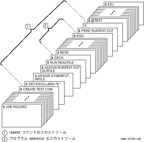 この例の Fortran および LINK コマンドは,プログラム A をコンパイルしリンクします。プログラム A が実行されると,論理装置 SYS$INPUT からプログラム A が読み込んだすべてのデータは,コマンド・ストリームから読み込まれたデータです。 DECK コマンドは,入力ストリームのレコードの最初の文字位置 (カラム1) にドル記号を入れられることを示しています。 EOD コマンドは,データの終端 (end-of-file) を示します。