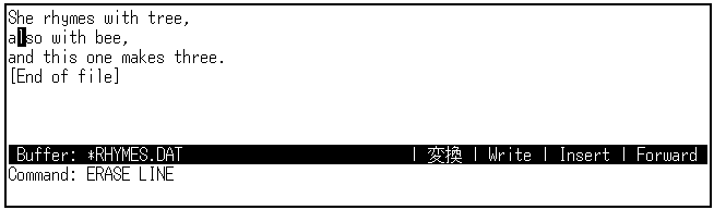 次の例は,テキストを削除する方法と回復する方法を示しています。 RHYMES.DATファイルを作成するために日本語EVEを起動し,次に示すテキストを入力します。