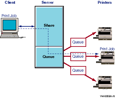 A print queue stores print jobs as users submit them. When a printer associated with the queue becomes available, the Advanced Server routes a job to that printer. Printers can be connected directly to the server by a serial or parallel port or directly to the network with a network adapter card. The server's queuing system, providing OpenVMS system information for handling print jobs, mediates between the Advanced Server and the printer so that print jobs can execute while users perform other tasks at their client workstations.