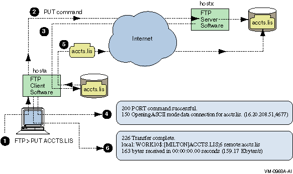 FTP> put MY.DOC "/usr/users/evt/my.doc" 200 PORT command successful. 150 Opening ASCII mode data connection for /usr/users/evt/mydoc (130.180.4.8,1 789). 226 Transfer complete. local: WORK1$:[VANA]MY.DOC;2 remote: /usr/users/evt/my.doc 289 bytes sent in 00:00:00.01 seconds (20.15 Kbytes/s) |