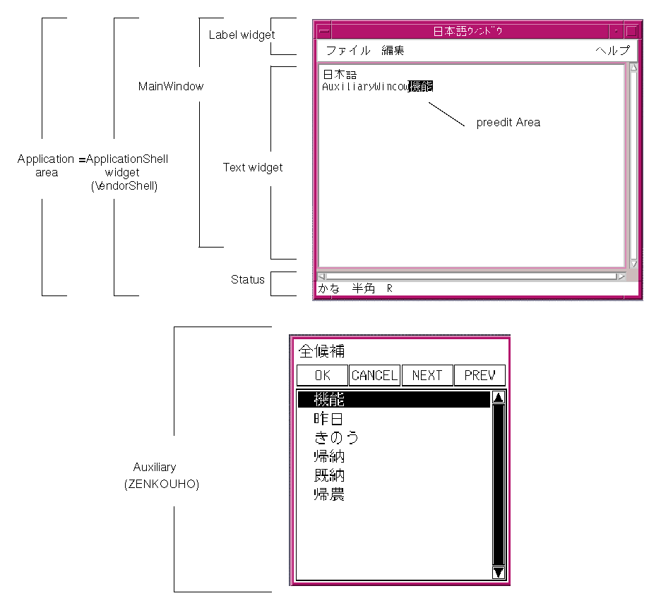 The user interface of the input method consists of several elements. The need for these areas is dependent on the input method being used. They are usually needed by input methods that require complex input processing and dialogs. See Figure 1-3 for an illustration of these areas.