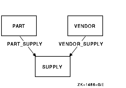 The DBA can specify a set type where each PART record occurrence can own SUPPLY record occurrences. Figure 5-7 is a Bachman diagram that shows the relationship between PART record types and SUPPLY record types. Bachman diagrams give you a picture of the schema or a portion of the schema. Each record type is enclosed in a box. Each set type is represented by an arrow pointing from the owner record type to the member record type or types. Thus, in Figure 5-7, PART is the owner record type of the PART_SUPPLY set type, and SUPPLY is the member record type.