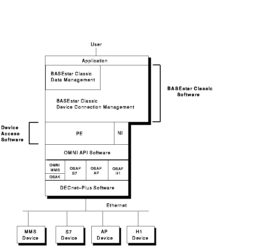 The BASEstar Classic DAS for OMNI software provides an interface between BASEstar Classic and OMNI software, the Compaq product which implements MMS application protocol. (Under Version 3.0 and following of OMNI software, the OMNI API and MMS protocol are split into separate products.) Furthermore, the DAS for OMNI software provides an interface between BASEstar Classic and the Siemens SINEC-S7/AP/H1 protocols using OSAP/S7, OSAP/AP or OSAP/H1 software, the Compaq products which implements these protocols under the OMNI software architecture.
