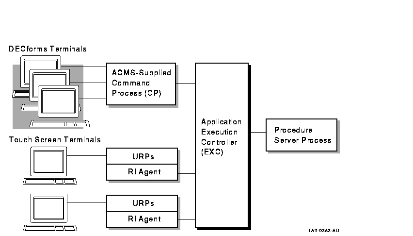 The ACMS Command Process (CP) uses DECforms or TDMS to interact with the terminal user. If you use the RI, you cannot use the CP; you must, instead, use either the ACMS-supplied RI agent or develop an RI agent that does the following:
