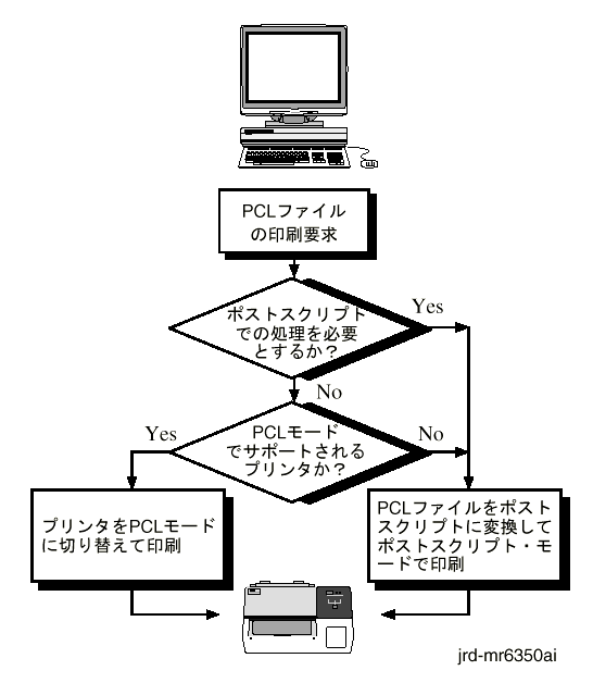 一部の PostScript プリンタにはPCLモードがあり,DCPS ソフトウェアはこのモードを使用することができます。プリンタがPCLモードをサポートしていて,ユーザがファイルの PostScript への変換を要求するパラメータを指定しない場合,ジョブは自動的に PCL モードで印刷されます。これをネイティブ PCL モードと呼びます。