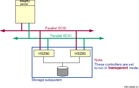 ホストからストレージまで複数のパスを持つパラレル SCSI 構成では,透過的フェールオーバによる構成よりも高い可用性とパフォーマンスが得られます。 図 6-9 に,この構成を示します。