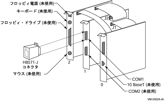 コンソール・ターミナルと追加装置を接続するには,図 5-2 「コネクタ」 を参照し, コンソール・シリアル・ライン (H8571-J コネクタ) をCOM1 に接続します。
