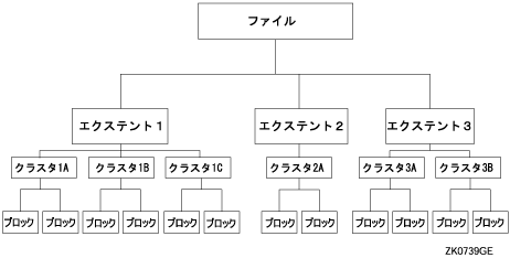 図 9-1 「ファイルのディスク構造階層構造」 は,ディスク構造内のブロック,クラスタ,エクステント,ファイルの階層構造を示しています。