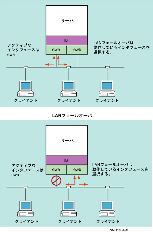 LAN フェイルオーバは,システムを LAN デバイスの障害から保護するメカニズムです。 LAN フェイルオーバでは,複数の LAN デバイスを,LAN フェイルオーバ・セットという 1 つの仮想インタフェースに統合することによって,この保護を実現します。 フェイルオーバ・セットは,1 個のアクティブな LAN デバイスと,いくつかのアクティブでない LAN デバイスからなります。 アクティブなアダプタに障害が発生すると,送受信動作は,自動的および透過的に,アクティブでないデバイスのいずれかに移されます。 LAN デバイスが 1 個だけのフェイルオーバ・セットを作成することもできますが,そのセットにデバイスが追加されるまでは,フェイルオーバは発生しません。 ソフトウェア: 論理 LAN ドライバ論理 LAN ドライバ SYS$LLDRIVER.EXE は,LAN フェイルオーバ・セットの動作を管理し,アクティブな LAN デバイス・ドライバへ I/O 要求を導くことによって,LAN フェイルオーバを実現します。 アクティブな LAN デバイスに障害が発生すると,LLDRIVER は,LAN デバイスに割り当てられている優先順位とリンクの状態に従って選択した,他の LAN デバイスに切り替えます。 ハードウェア: 論理 LAN デバイス論理 LAN デバイス LLc0 は,LAN フェールオーバ・セットごとに作成されます (c は,論理 LAN デバイスを一意に識別するための,ユーザ定義のアルファベットです)。 このデバイスは,擬似 LAN デバイス,つまり仮想 LAN デバイスです。 アプリケーションは,I/O 要求を,論理 LAN デバイスに送ります。 論理 LAN ドライバは,これらの要求を,アクティブな LAN デバイスに導きます。 ソフトウェア - LAN フェイルオーバ管理システム管理者は,LANCP ユーティリティと LANACP ユーティリティを使用して,LAN フェイルオーバ・セットを定義し作成します。 LAN フェイルオーバ・セットのコンテキストは,パーマネント LAN デバイス・データベースで管理されます。 システムの起動時,LANACP が再起動されると,LANACP はパーマネント・デバイス・データベースを読み取り,このデータベース内に記述されている LAN フェイルオーバ・セットの設定を行います。 システム稼働中は,フェイルオーバの状態と構成データを参照することができます。 また,パーマネント・デバイス・データベースと,運用デバイス・データベース内で管理されている現在のインスタンスの両方で,フェイルオーバ・セットの特性を変更することができます。 ネットワークの構成とハードウェアの要件LAN のフェイルオーバでは,フェイルオーバ・セット内の LAN デバイスが,同じ拡張 LAN に存在する必要があります。 この要件により,任意のノード間の LAN 通信を,フェイルオーバ・イベントの発生後も継続できます。 LAN フェイルオーバをサポートする LAN デバイスは,Alpha システム用としては DE500-BA,DE504-BA,DE600,およびその改良版,I64 システム用としては Intel 82559,A5230A,および A5506B,Alpha システムと I64 システム用としてはすべてのギガビット・デバイスがあります。 AlphaServer DS25 の内蔵 Intel 82559 チップも,同様にサポートしています。 ネットワーク接続障害の検出一般的に,LAN デバイスはネットワーク・スイッチに接続されます。 この接続の状態は,「リンク・アップ」または「リンク・ダウン」と表現されます。 「リンク・アップ」状態とは,LAN デバイスからスイッチへの有効な接続があり,LAN デバイスとスイッチの間でネットワーク・データを転送できる状態です。 「リンク・ダウン」状態とは,ケーブル障害や切断,または接続の片側に障害が発生しているために,有効な接続がない状態です。 スイッチの電源を切るかリセットすると,スイッチが再度動作状態になるまで,リンクは「ダウン」状態になります。 LAN デバイスがリセットされると,LAN ドライバがリセットを完了し,LAN デバイスが再初期化されるまで,リンクは「ダウン」状態になります。 LAN フェイルオーバは,LAN デバイスの障害,デバイスとスイッチを接続しているケーブルの障害,およびスイッチの障害からの保護を行います。 LAN フェイルオーバは,スイッチを越えた場所での障害,つまり,フェイルオーバ・セット内の LAN デバイスからは見えない部分の LAN 障害からの保護は行いません。 フェイルオーバ・セット内の各 LAN デバイスは,リンクの状態を監視し,LLDRIVER にそのリンクの状態を報告します。 LLDRIVER はリンクの状態を追跡し,アクティブな LAN デバイスが「リンク・ダウン」状態を報告したときに,フェイルオーバを実行します。 LAN フェイルオーバの制限LAN フェイルオーバには,次の制限があります。