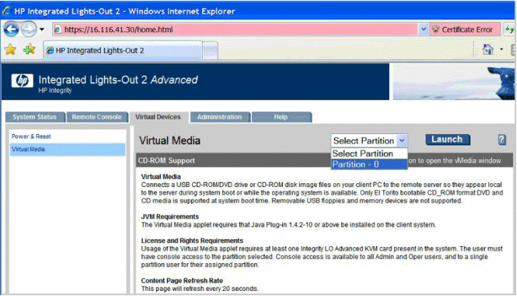 vMedia アプレットの使用権を有効にします。 Integrity サーバの電源がオンになっていることを確認します。