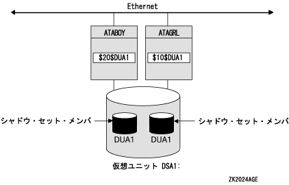 図 1-3 「MSCP サーバを経由してアクセスされるシャドウセット」 は,複数のノードに存在するローカル・アダプタに,シャドウセット・メンバが接続された状況を示しています。 この図の中で,ディスク・ボリュームは,2 つのノード ATABOY と ATAGRL の各々にローカルに接続されています。 MSCP サーバは Ethernet を経由したシャドウセット・メンバへのアクセスを可能にします。 ディスク・ボリュームは, 異なるノードにローカルに接続されていますが,同じシャドウセットに属しています。 1 つのノードにローカルに接続されているメンバでも, MSCP サーバを経由することで,リモート・ノードからアクセスすることができます。