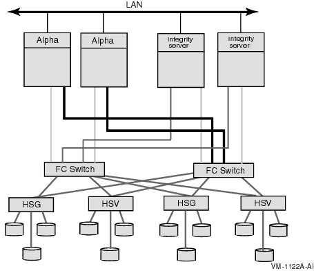 Figure 5-2 is a simplified version of a mixed-architecture cluster of OpenVMS Integrity servers and OpenVMS Alpha systems with locally attached storage and a shared Storage Area Network (SAN).