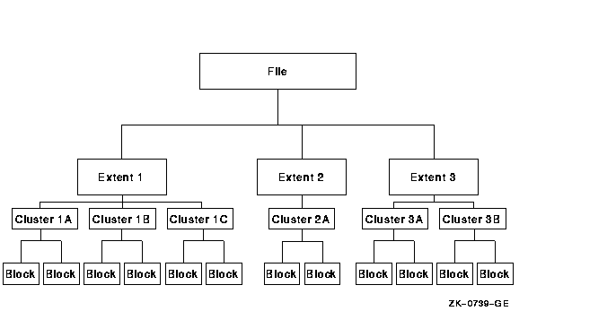 Figure 1-1 shows the hierarchy of blocks, clusters, extents, and files in the Files--11 ODS.