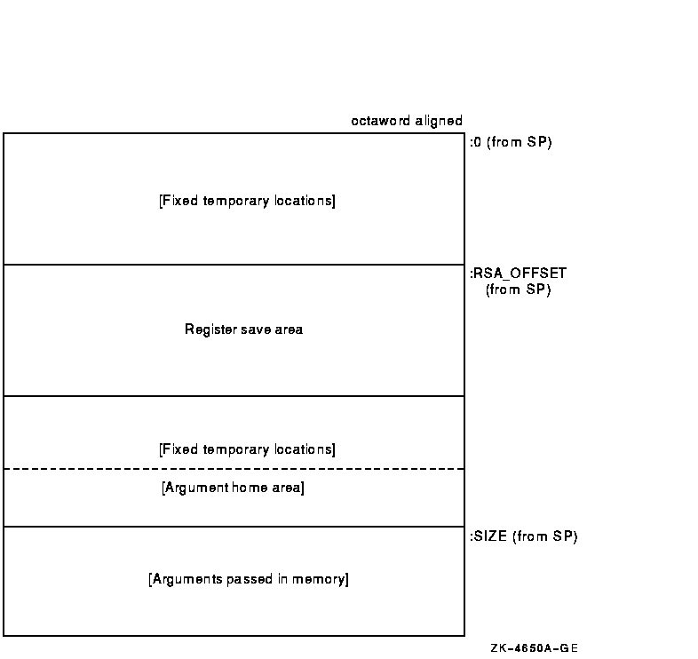 Use of the arguments passed in memory appending the end of the frame is described in Section 18.4. For more detail concerning the fixed-size stack frame, see the HP OpenVMS Calling Standard.