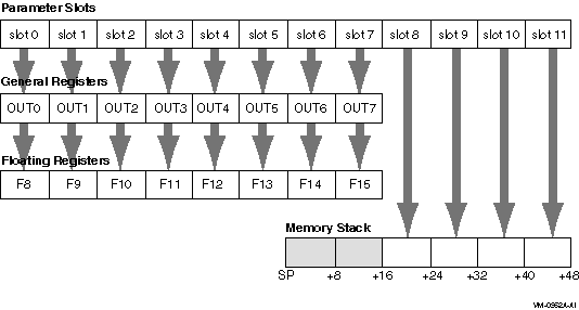 The contents of the first eight parameter slots are always passed in registers, while the remaining parameters are always passed on the memory stack, beginning at the caller's stack pointer plus 16 bytes. The caller uses up to eight of the registers in the output region of its register stack for integer and VAX floating-point parameters, and up to eight floating-point registers for IEEE floating-point parameters. The maximum number of registers used is eight.