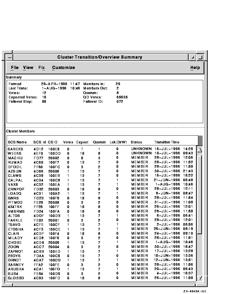 The Cluster Transition/Overview Summary window shown in Figure 3-15 displays information about each node in an OpenVMS Cluster. This window is very similar to the System Overview window; however, the Cluster Transition window lists only one cluster for each set of nodes in a cluster, while the System Overview window lists all the nodes and the user-defined groups the nodes are in.