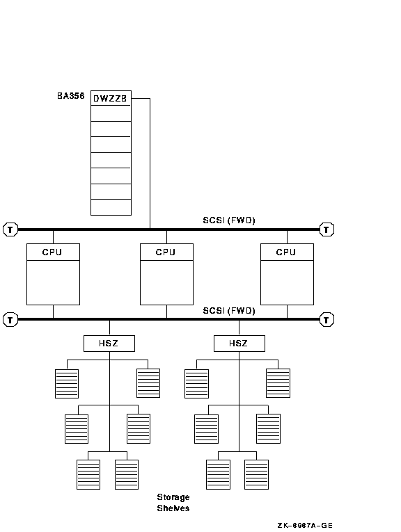 In Figure 9-2, three nodes are connected by two 25-m, fast-wide (FWD) SCSI interconnects. Multiple storage shelves are contained in each HSZ controller, and more storage is contained in the BA356 at the top of the figure.