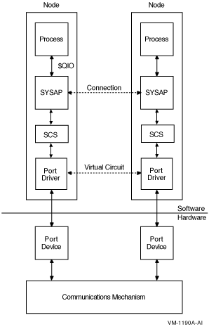 | SCS (System Communications Services) | 基本的な接続管理/通信サービスを提供する。これは, OpenVMS Cluster システム内のノードのシステム・アプリケーション (SYSAP) 間の論理パスとして実装される。 |
