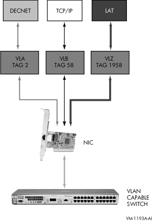 サポートされる Gigabit および 10-Gb LAN デバイス (10-Gb は Integrity サーバのみ) は, Alpha および Integrity サーバ上で VLAN トラフィックを処理する機能を持っています。