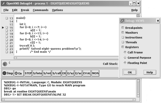 デバッガ・コマンドはプロンプトで対話的に入力するだけでなく,デバッガ初期化ファイルとコマンド・ファイルに格納しておいて, HP DECwindows Motif for OpenVMS 環境内で実行することができます。