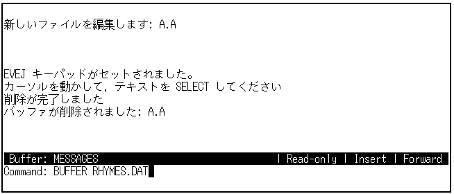 [Do]キーを押し,GET FILE SCHEDULE.DATと入力すると, SCHEDULE.DATファイルの最新バージョンを格納した新しいバッファが作成され, RHYMES.DATから表示が切り替わります。
