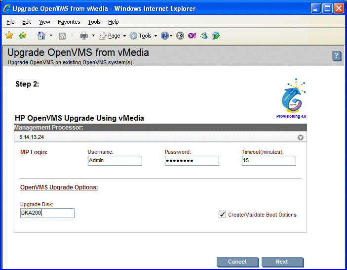これで,HP SIM を使用して,あるいはHP SIM とは独立して vMedia を使用して OpenVMS をプロビジョニングすることができます