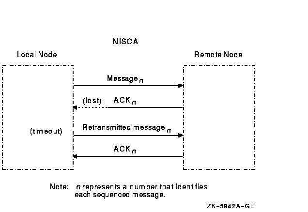 In Figure F-5, the remote node receives the message and transmits an acknowledgment (ACK) to the sending node. However, because the ACK from the receiving node is lost, the sending node retransmits the message.