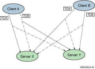 As an example of the first case, consider clients A and B both performing transactions TCA and TCB, where both TCA and TCB include a message to both server X and server Y followed by an ACCEPT. There is only one instance of Server X and Server Y available, and due to the quirks of distributed processing, only Server X receives the message belonging to TCA and only Server Y receives the message belonging to TCB. Figure 3-8 reflects this scenario. Because Server Y has no chance of accepting TCA until TCB is processed to completion and Server X has no chance of accepting TCB until TCA is processed to completion, Server X and Y are in a distributed deadlock. In such a case, RTR selects TCA or TCB to abort with DLKTXRES and replays it in a different order.