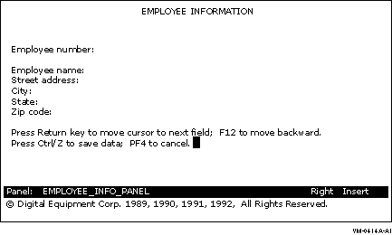 Figure 7-5 is an example of a data entry panel composed only of literals. The panel includes a message to users indicating how to navigate between fields (using [Return] and [F12] ), how to save the data (using [Ctrl/Z] ), and how to quit the screen (using [PF4] ). You define [PF4] later in this chapter. Because [Return], [F12], and [Ctrl/Z] are predefined in DECforms, you do not need to define them for use in this tutorial application.