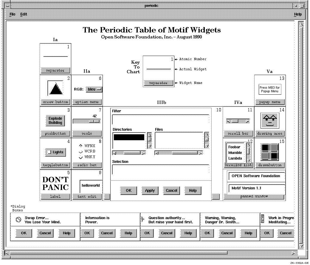 OSF/Motifデモ用プログラムのPeriodicは,OSF/Motifのさまざまなウィジェットの使用方法と見た目を示しています。Periodic のメイン・ウィンドウを 図 1-1に示します。
