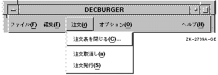 図 2-4に表示されているXmPulldownMenuウィジェットは, 注文表がすでに表示されているとき,DECburgerが使用する「注文」のPull-Down Menu ウィジェットです。このメニューの内容は注文表が見えているかどうかによって異なります。