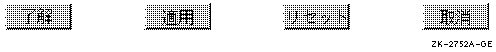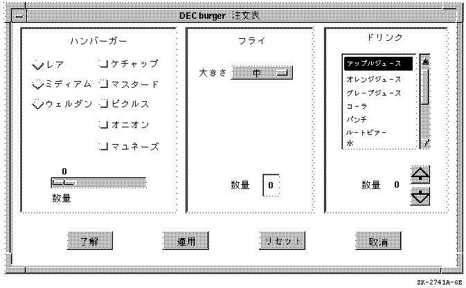 DECburgerは図 2-13に示すように,4 つのXmPushButton ウィジェットが組み込まれているXmFormDialogウィジェットを使用して「了解」, 「適用」,「リセット」,「取消」の機能を実現しています。 ガジェットでなくウィジェットを使用すると,より大きなフォント・ サイズを指定して,これらの重要機能を強調できることに注意してください。 ガジェットではフォントを指定できません。ガジェットはその親で指定されたフォントを使用します( この図はこれらのボタンで使用されている実際のフォントを表していません。 この属性を見るには, DECburgerアプリケーションを実行してください)。