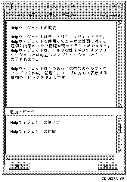 Helpウィジェットは,プログラマの作成したアプリケーションがヘルプ機能を提供するために呼び出す, 独立したアプリケーションとして表示できます。Help ウィジェットを使用すると,1つ以上のヘルプ・ウィンドウを作成および管理して, ユーザに表示する最初のトピックを決定できます。 Helpウィジェットの動作はモードなしのため,アプリケーションは1つ以上のHelp ウィジェットを同時にサポートすることができます。