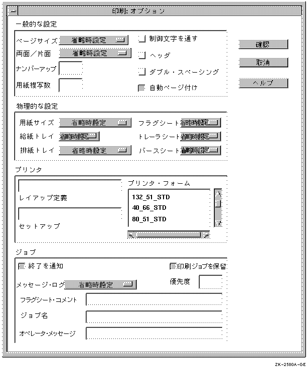 Printウィジェットの各種リソースを指定して,Printウィジェットをユーザに対して最初にどのように表示するかを定義できます。 これに関しては『日本語DECwindows Motif for OpenVMS拡張機能説明書』(日本語),『DECwindows Extensions to Motif』(英語)に説明があります。ユーザはその後,必要に応じて印刷オプションを変更することができます。