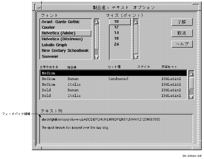 頻繁にテキストをカスタマイズする場合は,ポイント・サイズ,フォントの種類の選択肢を1 つのダイアログ・ボックスに統合して,1回のカスタマイズのために複数のメニューを表示しなくてもいいように設計してください。 たとえば,図 3-6のようなダイアログ・ ボックスを作成してください。