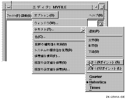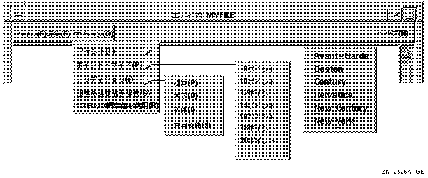 選択肢の数が少ない場合は,図 3-4のように,1 つのサブメニューのみでポイント・サイズおよびフォントの種類をカスタマイズすることができます。