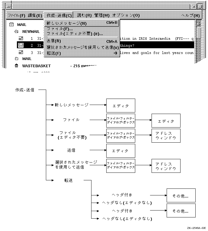 たとえば,図 5-3では,メール・ アプリケーションの概要を説明しています。 追加トピック「メッセージを読む」, 「メッセージの作成および送信」はそれぞれ「読む」メニュー, 「作成−送信」メニューに対応しています。