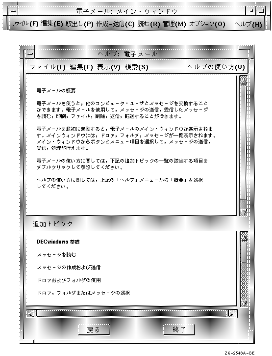 タイトル・バーは,ヘルプ・タイトルとウィンドウ・メニュー・ボタンで構成されます。 図 5-8に示すように,たとえば電子メールのヘルプ・ タイトルには,「ヘルプ:電子メール」と表示します。