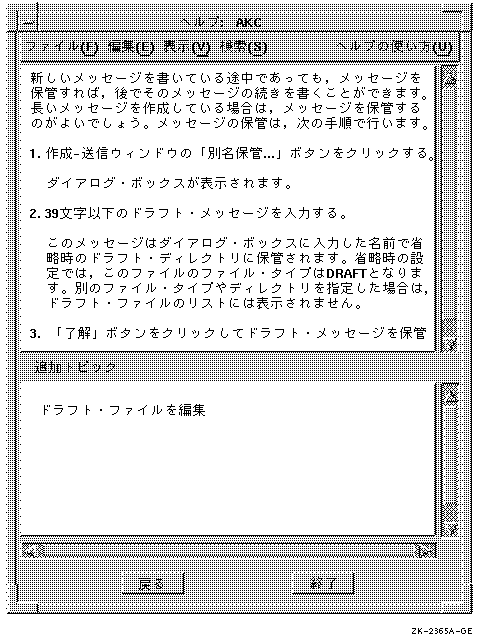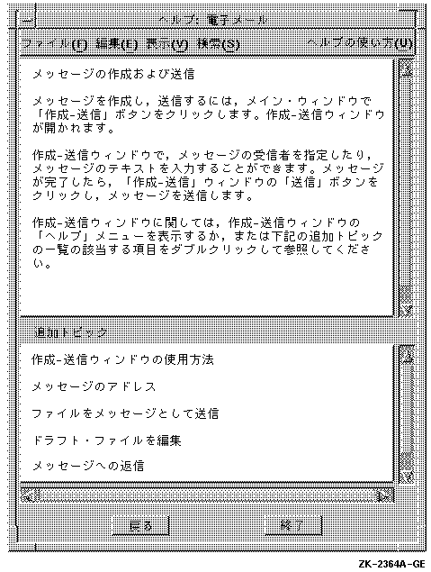 DECのHelpウィジェットは,「ヘルプ」メニュー,ヘルプ・コマンド, 「ヘルプ」プッシュ・ボタン,ヘルプ・キーから起動できる特殊ウィンドウです。 ヘルプ・ウィンドウの上の枠には,ユーザがヘルプを要求した画面表示物や機能に関する情報, つまりヘルプ・トピックが表示されます。