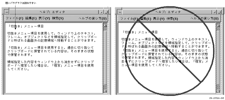 図 5-7はヘルプ・トピックのよい例と悪い例を示しています。 左のヘルプ・トピックは,空白行を使用しテキストを短いパラグラフに分け, テキストの密度を下げ,画面上でより読みやすくなっています。 読みやすくするためには,パラグラフは4つ以下に抑えてください。