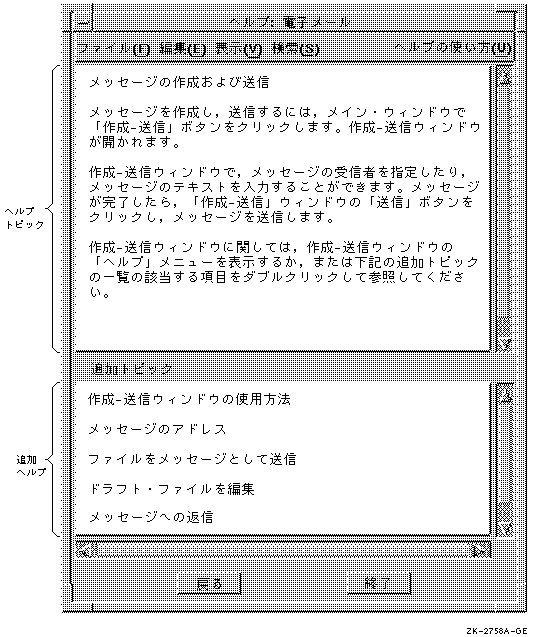 図 5-2は,「作成−送信」メニューを説明するヘルプ・ ウィンドウと追加トピックの例です。追加トピックは「作成−送信」メニューのメニュー項目に対応しており, それぞれのタスク指向の追加トピックは, 各メニュー項目に割り当てることができます。 たとえば,1番目の追加トピック「新しいメッセージを作成して送信」は「新しいメッセージ」メニュー項目と対応しています。